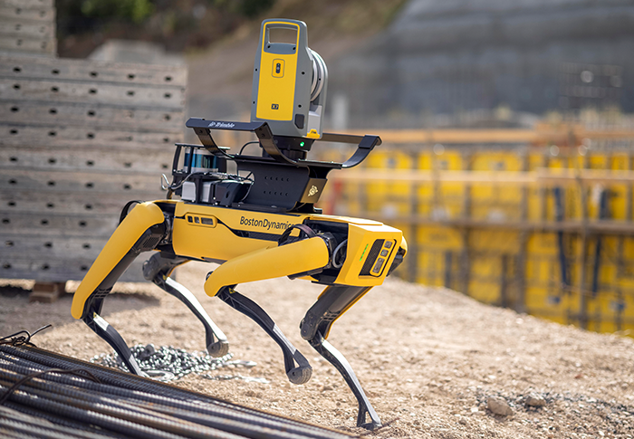 測量機を搭載した四足歩行ロボットがブース内を移動して、ライブ映像や測量データを送ります。