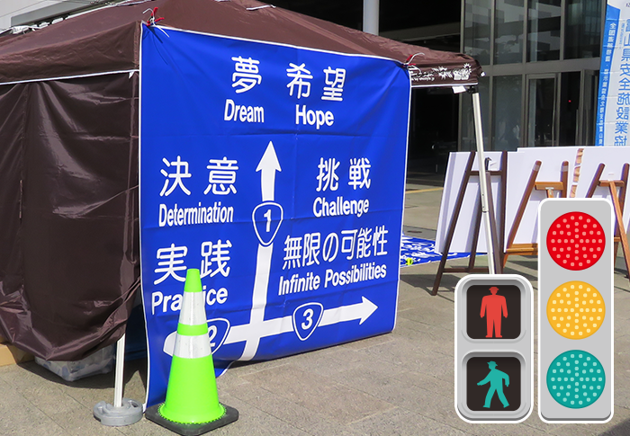 交通標識の実物シート、信号機の実物展示による大きさ体験。光源に向かって光が戻ってくる(再帰反射)を体験しよう!