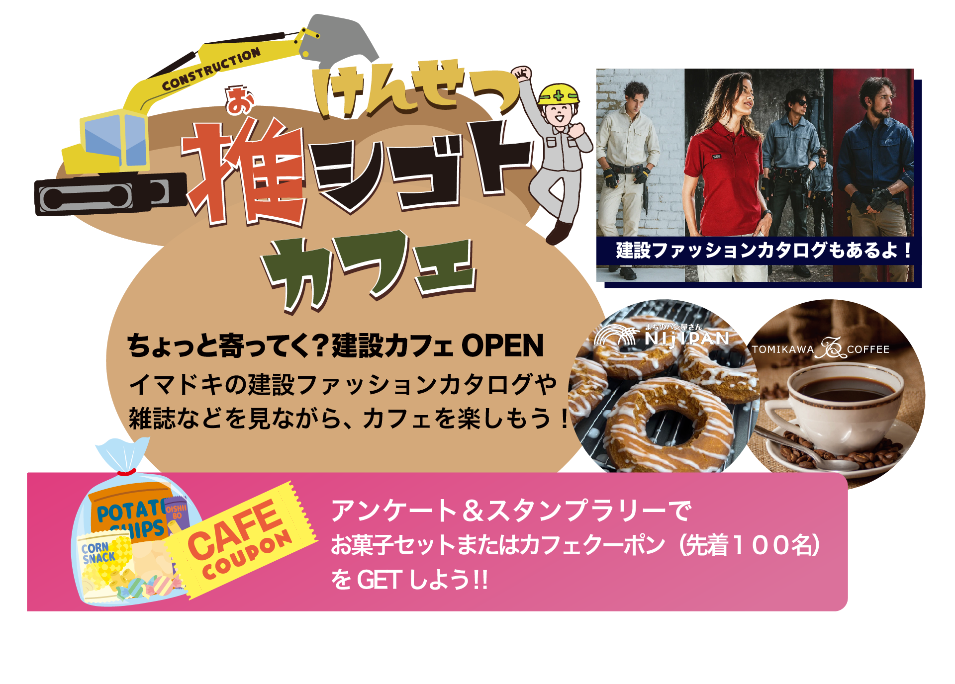 スタンプを集めてさらにアンケートに回答すると、お菓子詰合せまたは会場内カフェで使える100円引きクーポン(先着100名)がもらえます。